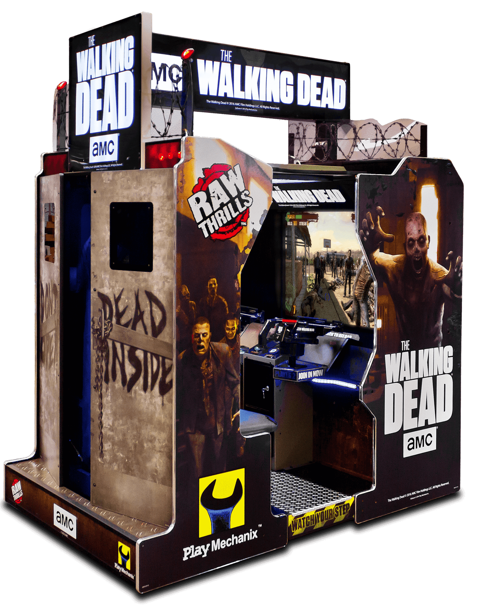 La série télévisée à succès AMC The Walking Dead a été officiellement transformée en une expérience de jeu d’arcade pas comme les autres. Avec des arbalètes authentiques, les joueurs visent et tirent sur les morts-vivants et sauvent des innocents. L’éclairage intérieur et un système audio Thrill-D tremblant garderont les joueurs sur le bord de leur siège alors qu’ils luttent à travers des nuées de zombies pour atteindre la sécurité. Les actions et les mouvements rapides exigent une précision et des réflexes rapides. Des armes supplémentaires, tels que des pistolets à clous, des couteaux, des pieds de biche, etc. aideront le joueur à s’échapper des Zombies. Sauver les autres survivants de la horde qui approche offre aux joueurs un bonus de santé, ce qui réduit les chances qu’ils rejoignent eux aussi les rangs de The Walking Dead®. Jouez avec des amis ou jouez seul, si vous osez!